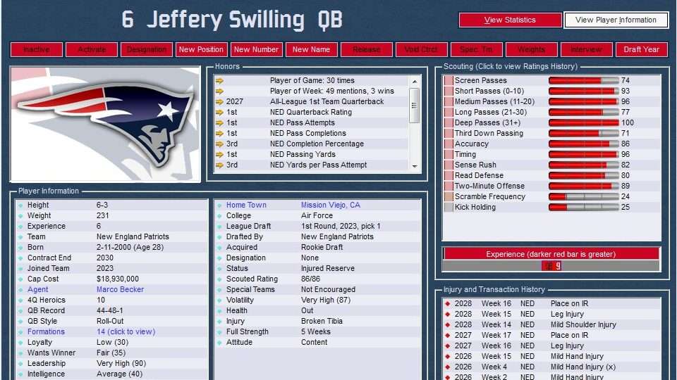 Welcome to SSG Pro Football, a thriving community where passionate fans come together to experience the excitement of simulated NFL games using Front Office Football software. Established in 2015, SSG Pro Football offers a unique real-time schedule, simulating one game per week to mirror the NFL calendar. Founded by dedicated enthusiasts, the league meticulously replicates the intricacies of professional football, fostering camaraderie and strategy-sharing among members. Whether you’re a seasoned veteran or new to the world of virtual football, SSG Pro Football provides an immersive journey into the thrill of the gridiron, where the timeless allure of the sport comes to life with each weekly simulation.